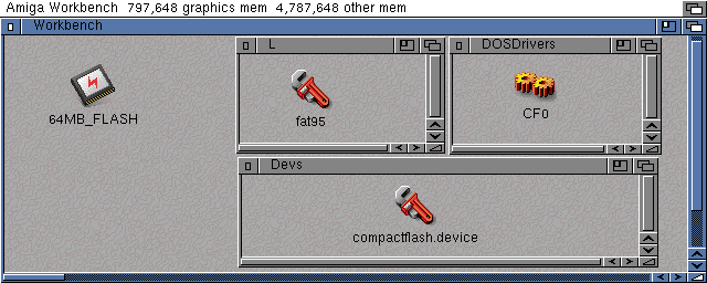 I've also given HDToolBox a go. It can only find the card if 'compactflash.device' is in Workbench:Devs and it appears to install and partition the card ok if the mountlist of CF0 is set to L:fat95. But with the mountlist of CF0 set as L:FastFileSystem HDToolBox cannot see it :-?